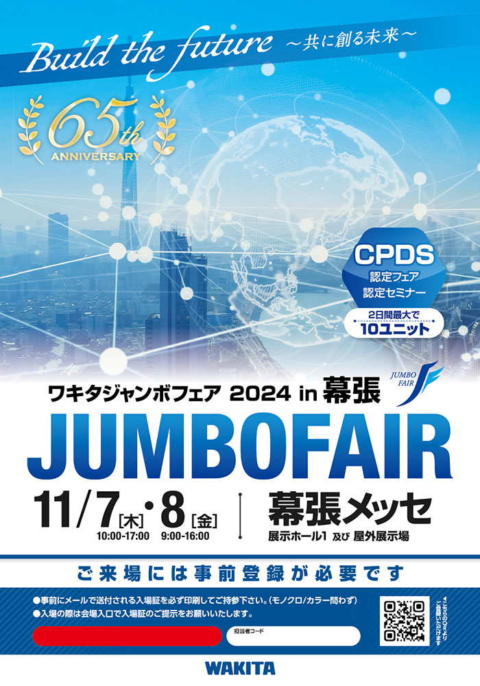 2024年11月7日(木)~8日(金)の2日間、幕張メッセで開催される『ワキタジャンボフェア 2024 in幕張』“Build the future ~共に創る未来~”に出展いたします。